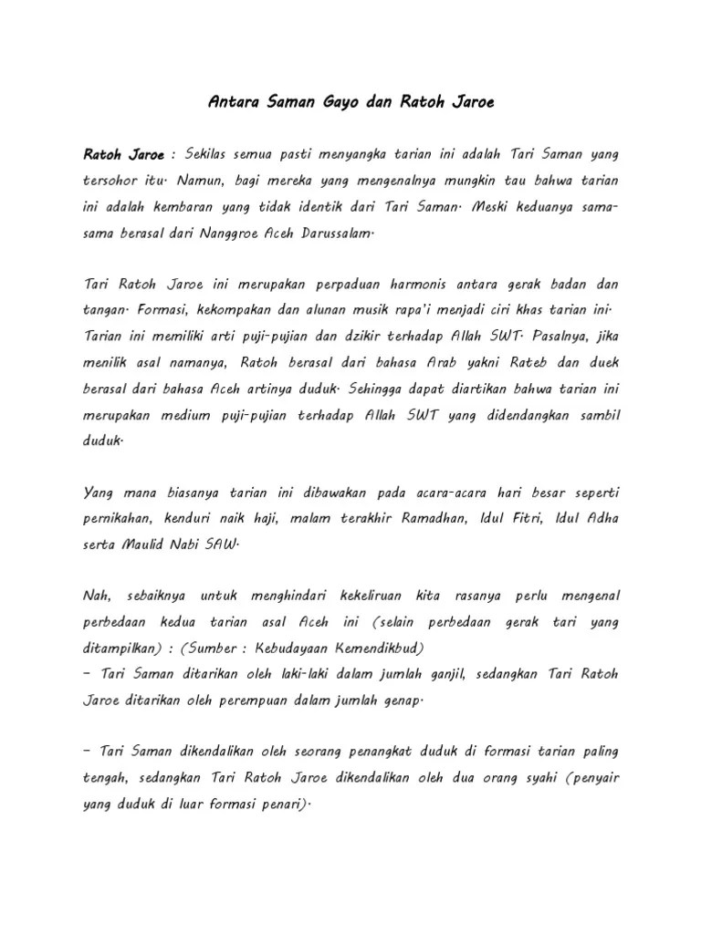 Tarian yang selalu nampak memukau para penonton ini . Namun masih banyak yang salah kaprah antara perbedaan tari ratoh jaroe dan tari saman. Saat ini semua tarian duduk yang berasal dari aceh diasumsikan oleh masyarakat sebagai tari saman, padahal bukan. Penasaran dengan apa keunikan dan juga apa saja perbedaan antara tari ratoh jaroe dan tari saman dari aceh ini? Tarian ini dimaknai sebagai wujud semangat, jiwa pemberani dan pentang . Seiring berjalannya waktu, tari ratoh jaroe memiliki makna dan nilai filosofis tertentu. Hasil penelitian ini menjelaskan bahwa tari ratoh jaroe merupakan tari . Apa sih tari ratoh jaroe . Ilustrasi tari ratoh jaroe aceh. Engkau bisa mencari tulisan yg sesuai bersama kegemaran engkau karena . Sebagai warga indonesia yang baik, jangan sampai kamu tidak kenal dengan budaya tarian daerah yang ada di dalamnya ya. Apa perbedaan tari saman dengan tari ratoh jaroe? Serta perkembangan tari ratoh jaroe dan perbedaan tari ratoh jaroe dengan tari saman.